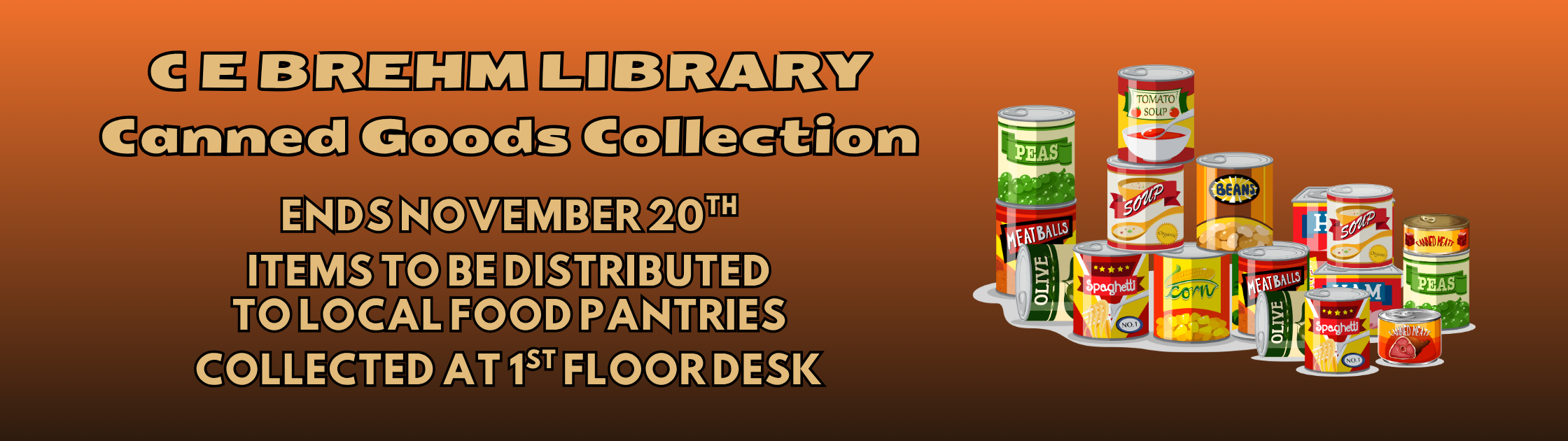 Until November 20th, the C E Brehm Library Will be collecting canned goods to be distributed to local food pantries. Items may be dropped off at the 1st Floor desk.